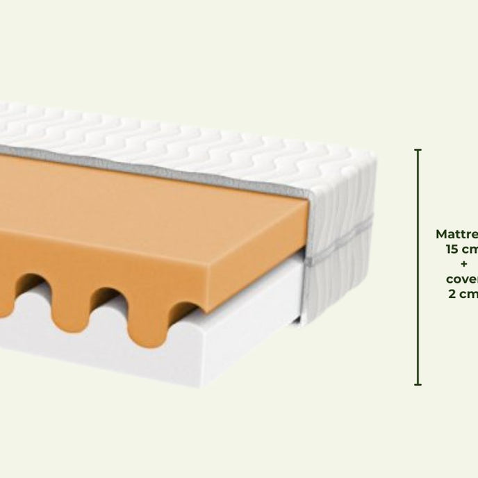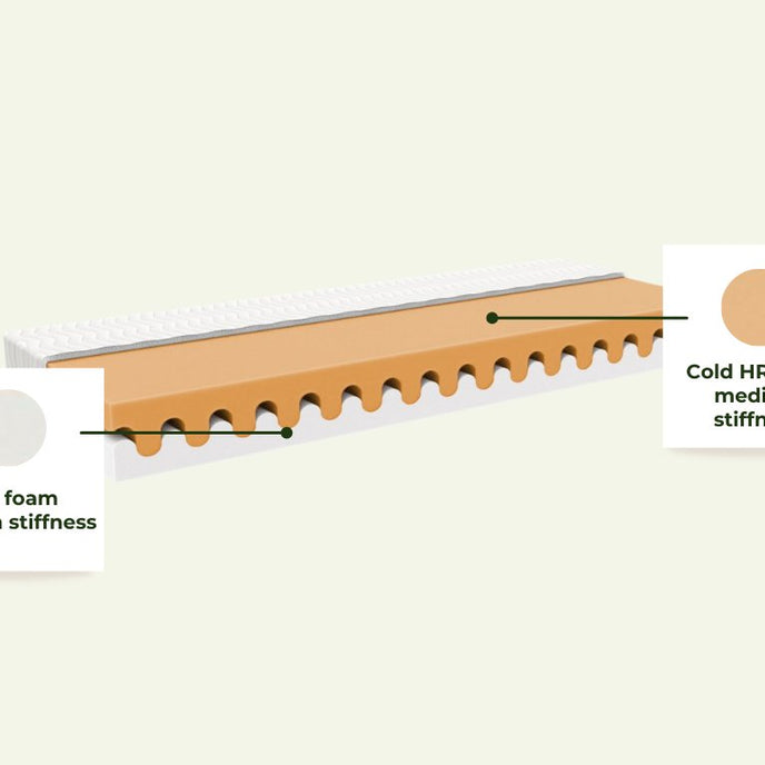 This mattress is completely anti-allergy and has a height of 15 cm. Moreover, it is available in several different sizes so that it was suitable for any bed. The filling is made from HR foam T25 and PUR foam T28 that are layered with a little space in between, which makes your sleep even more comfortable. How does it work? When you lie down, the layers sink into each other and adapt to your sleeping position. Moreover, all parts are connected with a special natural Swiss water-based glue.